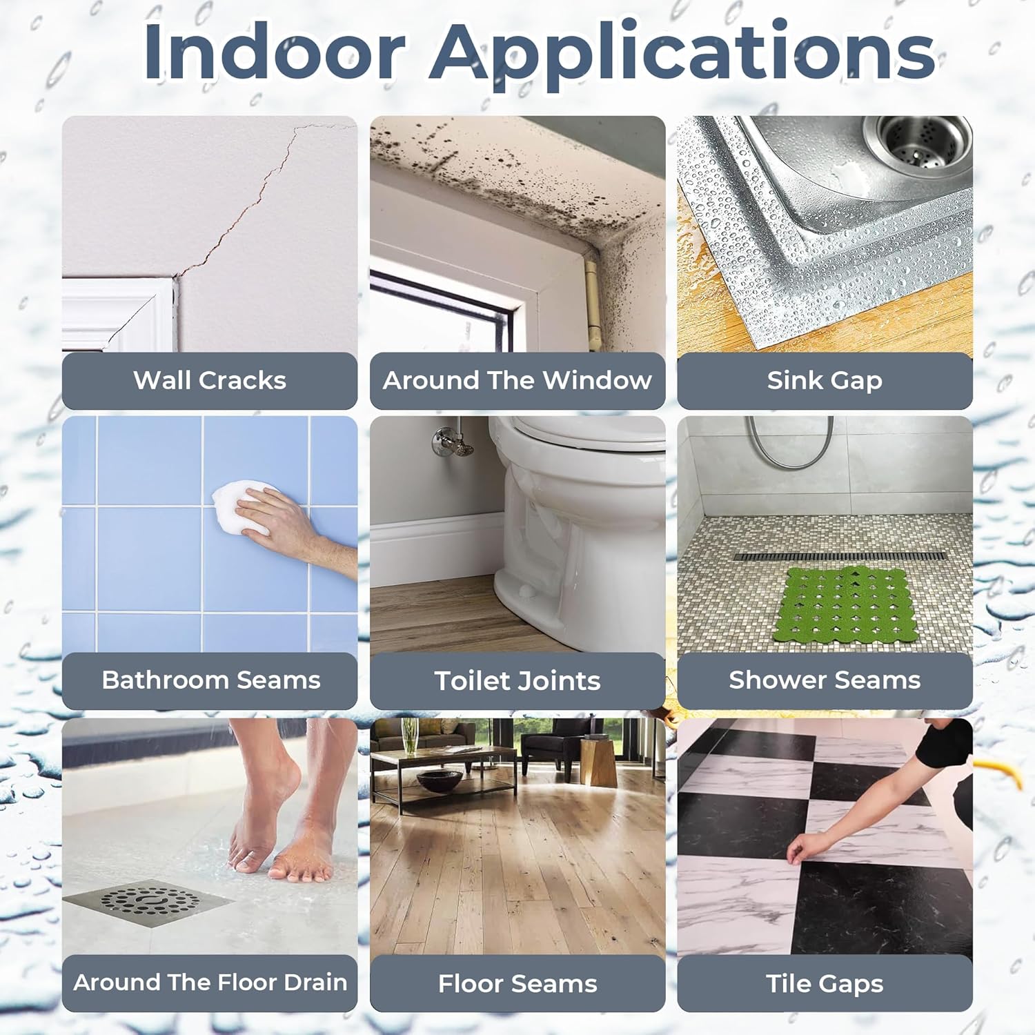 Suitable for waterproof constructions of cement surfaces, metal, ceramic tile, marble, wood, plastic,and other surfaces. Widely used in toilet gaps, ceramic tile gaps, windowsill, balcony, exterior walls, ground, bathroom, kitchen, roof, etc.